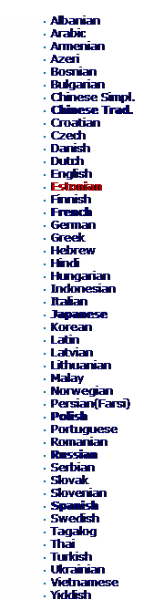 | | | | Unsurpassed Translation With a massive 275,000 entry English <-> Estonian Translating Dictionary, an easy to use 39 language translating Picture Dictionary, and complete English explanatory dictionary, the remarkable new EEs900 contains everything you need for superior translation and accurate communication. Exclusive User Dictionaries allow you to store your own personalized lists of frequently used words and a history function remembers your most recent translations to provide instant access to the information you need to understand and be understood. Scan and Read Translation Using the included Ectaco/C-pen Handheld Scanner you can grab any text wherever you find it. Simply scan the text you want from any paper surface - a book, newspaper, doctor's prescriptions or a poster on the wall and you will see the scanned text on the screen. You will then be able to upload it to ECTACO translator in order to get an instant translation of individual words. In addition, with the help of the included mini-USB to USB adapter and ECTACO software (sold separately) you can use the Ectaco/C-Pen to import image data to your desktop or laptop PC as well. Advanced Speech Capabilities Delivering flawless voiced output of all the words in its enormous database with True Voice human pronunciation, the EEs900 offers a unique chance to improve your pronunciation by hearing how a native speaker says a word or phrase. A pre-recorded word list provides access to the dictionary’s spoken entries. The world’s most advanced English Speech Recognition modules let you speak into the device in your own language and get an instant, hands-free translation that can be spoken out loud in the target language. Dependable Audio PhraseBook A fully functional talking, translating Audio PhraseBook provides you with all the words and phrases you need to communicate in almost any situation. Divided into 15 easy to navigate topic areas, it includes 14,000 phrases so that there's nothing you won’t be able to say. Simply select a category, press the 'Say' button and the translator speaks the phrase fluently in the language of your choice. Successful Language Study One of the most effective methods ever designed for language study, it employs the advanced True Voice and Speech Recognition modules and step-by-step lessons to guide you comfortably from beginner to advanced speaker. With a full set of enjoyable games and exams, you improve your language skills naturally and intuitively. In addition, with the unique Word-of-the-day utility, a Memorize splash screen appears when starting an application to show you a useful word or phrase, a translation and a corresponding picture. It's an excellent way to improve your vocabulary and master a foreign language! Loaded With Extras The EEs900 offers the most sought-after extras to make every trip you take more enjoyable. The included jetBook Reader lets you read and translate your favorite e-Books. A handy Voice Recorder lets you record conversations and audio notes and the built-in Video Player supports .avi, .wma, .wav, .ogg, .jpg and .png audio, video, and image formats so you can access your favorite media files anytime, anywhere. EEs900 also includes an FM radio to help keep you up to date on the latest news while a Calendar, a World Time clock, Metric Conversion, and a Calculator keep you organized to save you time and money. Complete Support Easy to navigate and astonishingly responsive, the customizable and intuitive Windows CE powered interface offers instant access to the information you need quickly, easily and dependably. A Smart Virtual Keyboard with Audio interface and layout for both languages complete the built-in support that makes the EEs900 different from all the rest. Features: Large 3.5” color LCD screen 275,000 entry English <-> Estonian bilingual translating Dictionary 70,000 English explanations with the WordNet Princeton English Dictionary Unique User’s Dictionary lets you create personalized word lists Advanced English and Estonian Speech Recognition True Voice human pronunciation of all English words and phrases Pre-recorded words list provides access to spoken dictionary entries Talking 39 language Picture Dictionary with pronunciation for all words 14,000 entry Audio PhraseBook for commonly encountered situations Unbeatable Word-of-the-day vocabulary builder Spell-Check, History and Slang Lock options Smart Virtual Keyboard with Audio interface Vector Ultima™ spell-checker and English Morphofinder™ to help find the words you need Customizable interface with support for the C-Pen/Ectaco handheld scanner English Grammar and SAT 200/5000 vocabulary builders Linguistic Crossword, Pockets, Spell-It-Right, FlashCards, Hangman games and a Translation Test Customizable translating jetBook Reader with FB2, TXT and XML file support Video Player with .avi, .wma, .wav, .ogg, .jpg, and .png. support; Voice Recorder; FM Radio SDHC card support of up to 32GB